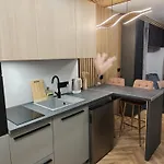 Ein Herd und ein Geschirrspüler sind in einer Küchenzeile dieser Unterkunft vorhanden. Die Bushaltestelle Elblaska liegt ziemlich nah am Green Baltic Portovo Comfort Apartment City Center Balcony entfernt.